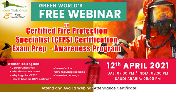 Green World Group hosts a FREE WEBINAR on Certified Fire Protection Specialists (CFPS) @ 12th April 2021 evening 08:30 P.M. (India Time).
